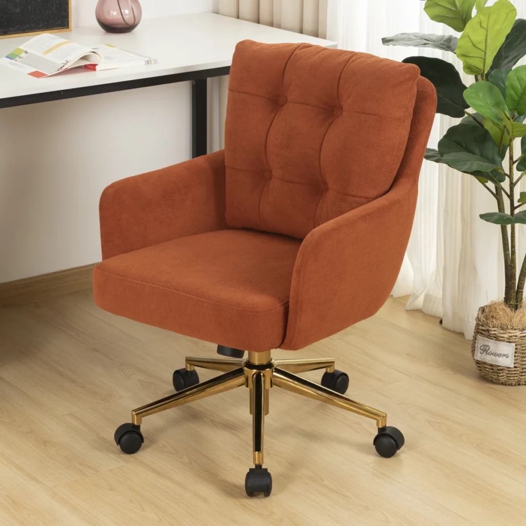 This rust velvet office chair brings warmth and personality to a home office while still feeling polished and refined. The rich velvet upholstery and subtle tufting give it a cozy, elevated look that feels more like a lounge chair than a traditional desk seat — perfect for adding character to your workspace.