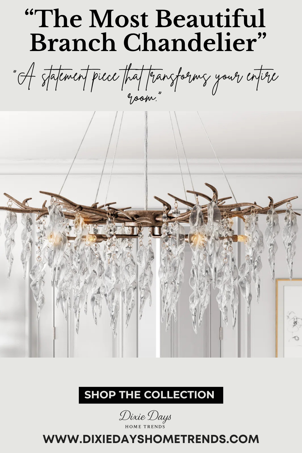 I’ve been obsessed with branch-style chandeliers lately — that mix of sculptural gold branches and dripping crystals is the ultimate