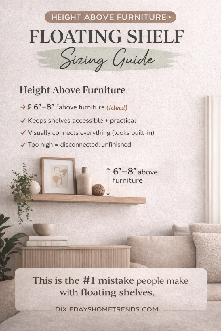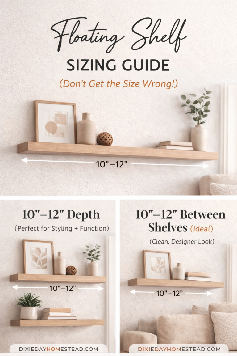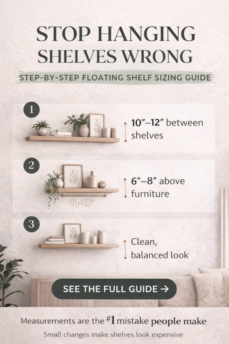 Getting the size right is what makes floating shelves look expensive and professionally styled. Most people choose shelves that are too small or hang them too high — and it completely throws off the look. Here’s exactly how to get it right.”