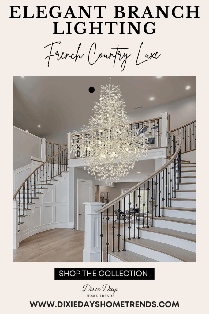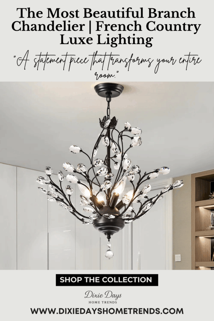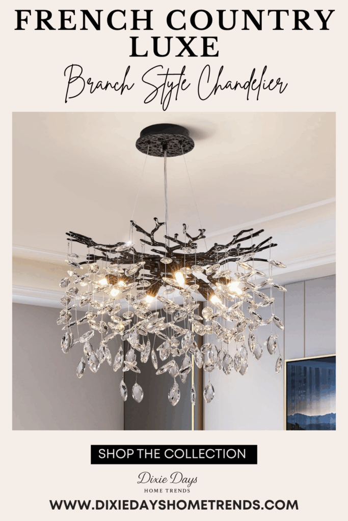 I’ve been obsessed with branch-style chandeliers lately — that mix of sculptural gold branches and dripping crystals is the ultimate blend of French Country romance and modern organic luxury. The problem? Some of them cost as much as a car!