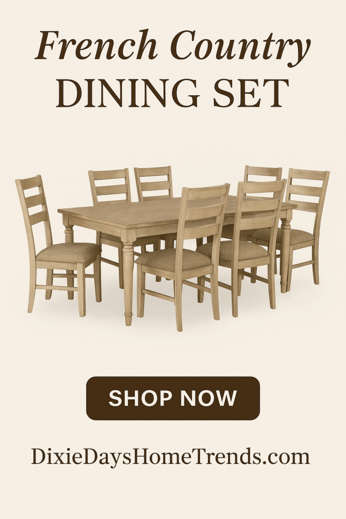 Bring warmth and charm to your dining room with this classic French Country dining set. The natural wood finish, soft tones, and ladder-back chairs give it that effortless rustic elegance that fits beautifully in both farmhouse and traditional homes.